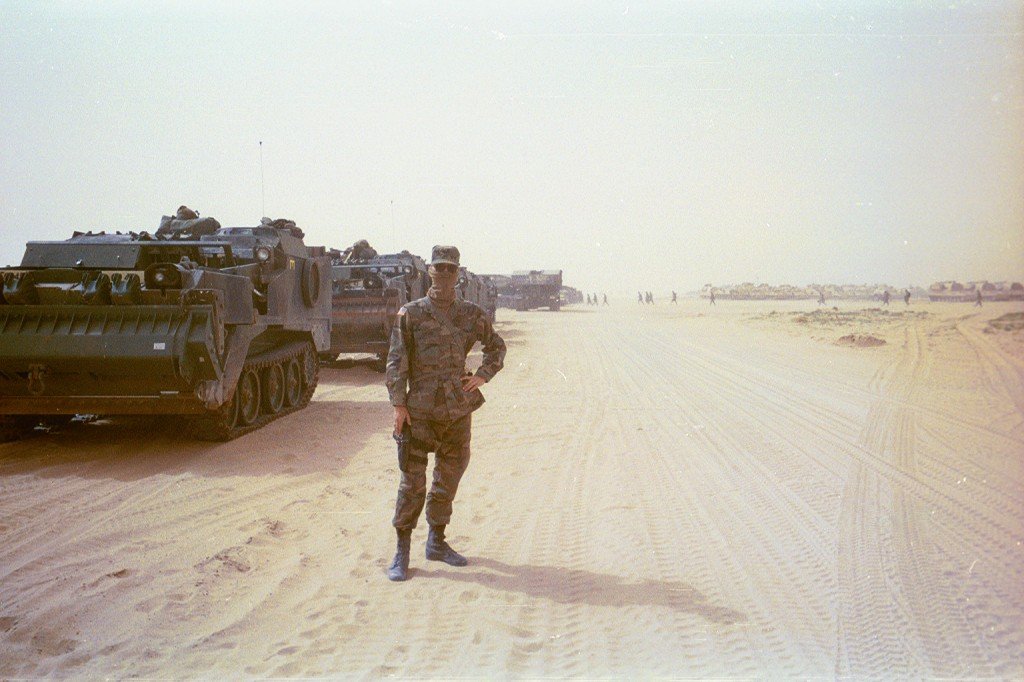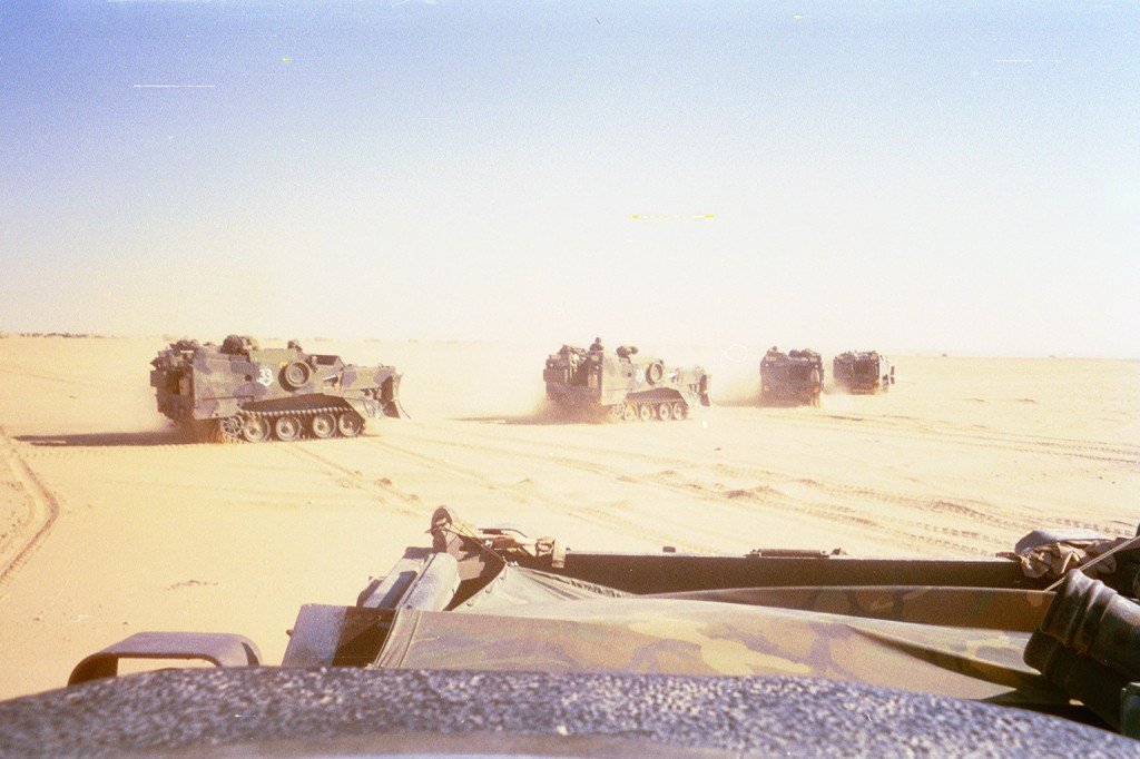 The last time we moved there apparently wasn’t a handy sandstorm available to cover our movements from Iraqi spies, what a pity. This time we spread way out in our final, “Attack Postions”, which meant no trailer stores, apparently. We lived on our vehicles, and as there were no latrines, we learned to be very careful when stepping around another’s track. Looking back, I was pretty lucky to have my own ride. The Line Platoons were 8 grunts to an M113. I honestly can not imagine it.
