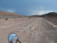 Decently early start on day. Road less hilly, but more sand and precarious washed-out bits. Adrian loves every minute, Carl whimpers at every rocky rise. He finally dumps bike on sandy curve, Adrian beams, snaps photos. Carl curses street tires & leaky gas cap, contemplates gas-soaked tankbag & contents. It takes 2.5 hours to travel 50 miles.