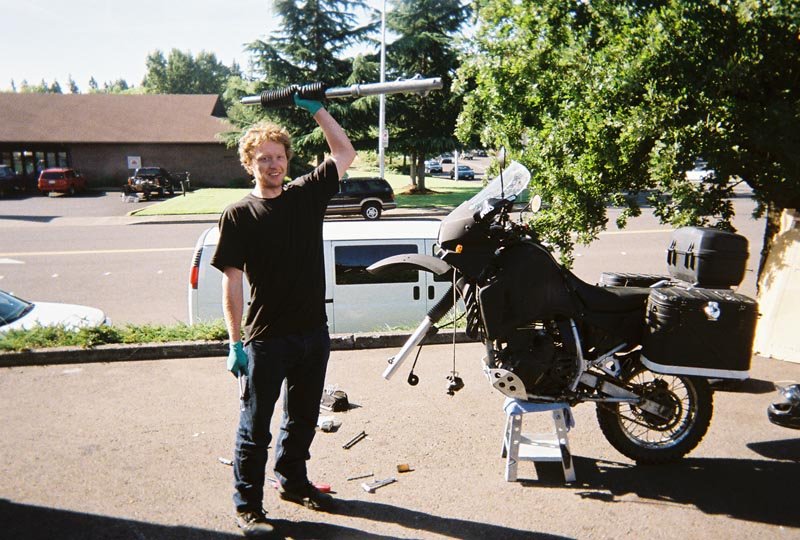 Wake up to put Adrian’s bike back together. Carl vs. Adrian arguments flare up again, and we ask Cam to act as judge and resolve them once and for all. Cam, a retired police sergeant, is very fair and deliberate in his decisions, which we agree to abide by. Leave Cam’s in flurry of good wishes, hoping Adrian’s bike is on the mend. Reach Redding dealer, more than apparent Adrian’s bike is not on mend. Oil still dripping, making drastic puddles in dealer parking lot. Determine oil is blowing out the breather hose. So-called KLR mechanic at shop suggests bike is overfull with oil, which is clearly not the problem, but he is generous with rags, drip pan, oil disposal. Shop wants $80 just to look at the bike.