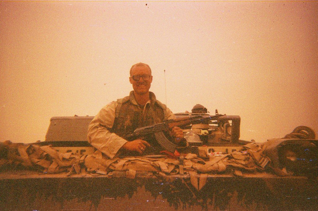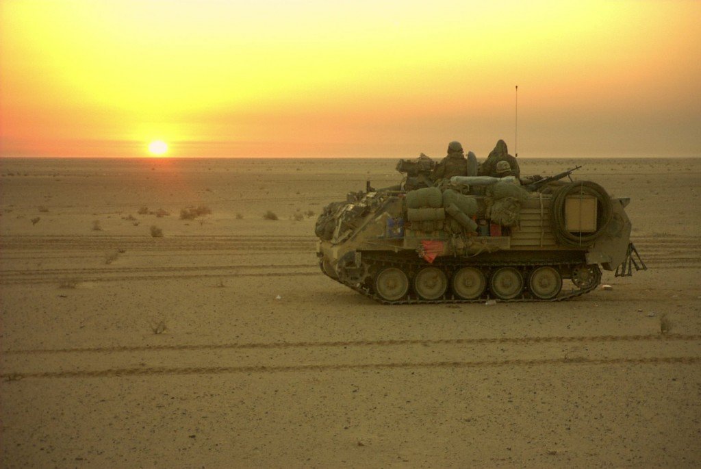 The next day, the wind started to pick up and one side of the sky turned orange. I had seen sandstorms before, but never that turned everything orange. We were headed North again, and I got called over the radio to tow “Rock 8″, which was the company TOC–The Tactical Operations Center in an M577, which is basically a taller M113 that you can stand up inside. I hooked up and started to tow but then had to slow down because I couldn’t see a damn thing in front of me. It was only 1300 but the sandstorm made everything look reddish-orange as Mars and dark as twilight. Looking behind me, I could make out the 577 with Sergeant Showers pulling security on the top of it with a shirt wrapped around his face and goggles on but I couldn’t see more than a few feet in front of me. I had worn my prescription-strength sunglasses every day for the last three months and couldn’t find my regular glasses anywhere at that exact moment(they later turned up). I suddenly had a revelation and put on my gas mask, as it had prescription inserts inside. Despite the heat, it was actually much better from the sandstorm with the mask on. I turned around and gave Sgt Showers the thumbs up. A minute later, we hit a big bump and I turned around to see how they were doing. Showers and his driver, Acker, had thrown their weapons in their hatches and were frantically pulling on their chem suits with their masks on. Turns out they had lost comms along with their motor. It took a few minutes for me to visually interrupt and re-assure them that they weren’t going to die. They later thought it was funny. Much later.