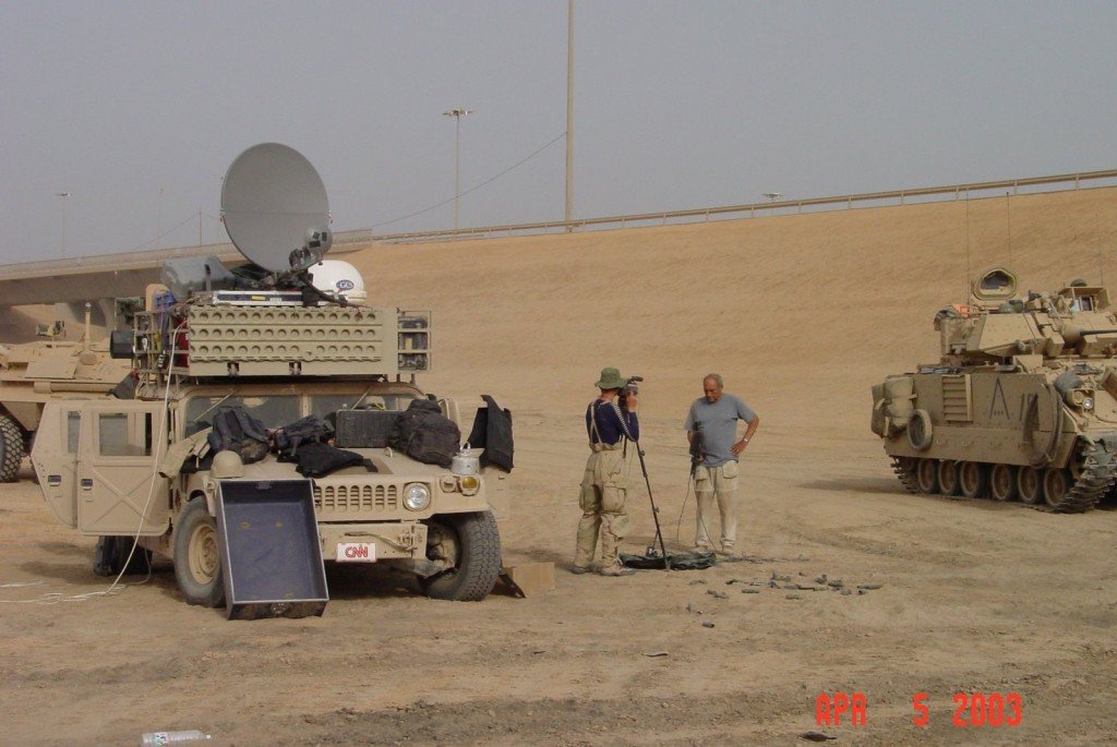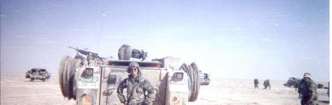 That’s right; the ass-end of an AVLB. I figured(correctly, it turned out), that shadowing this huge, hulking monstrosity, the Hadjis(Iraqis) would shoot at the bulletproof “Armored Vehicle, Laying Bridge” first, rather than my tiny tin-can of an ACE. We drove Northish into Iraq & then took a North-East route directly across the desert, to a tiny town called in the middle of Anwar province. Apparently the plan was to send the mean Marines up the middle through Basra to Baghdad, while the faster Army Cav swept around the South-East to cut off any re-enforcements coming South from where they were stationed by the Turkish border. It was a good plan, and it worked well, but for us, it was less than ideal. We were attached to The Cav, specifically 3/7 Cav(Gerry Owen, Custer’s regiment. Isn’t that reassuring), but because their M1s and Bradleys were so much faster, we in our old 113s, ACEs, AVLBs and wobbly C-trucks were left far behind. The different vehicles all charged through the difficult sand at different speeds, so we ended up stretched out miles apart. My ACE had a throttle-lock, and I had rigged a steering lock too, so I would actually get out of the hatch to stretch and do maintenance while bouncing along at 30mph! Not for too long, or it would veer to one side. I wonder what would have become of me if I had bounced off. I fabricated the rope-tie for the wheel after the first day, when I realized that you really can do everything “behind the wheel”. I mean, I knew you could eat, radio, pick your nose and shoot, but when you really have to go… I set the throttle, steered with my toe, and stuck my ass over the side of the ACE. Considering that it was my happy home, I stuck it as far as possible over the side. About a minute later I saw a flash and jumped back in and yanked out my 9mm. Turned out SPC Holloway(or Hollow-Head, as we called him) had thought it would be funny to snap a picture of SPC Larson’s bare bum. (Don’t worry, the picture will not be shown here) It was not my last time to “do the Duece” under fire.