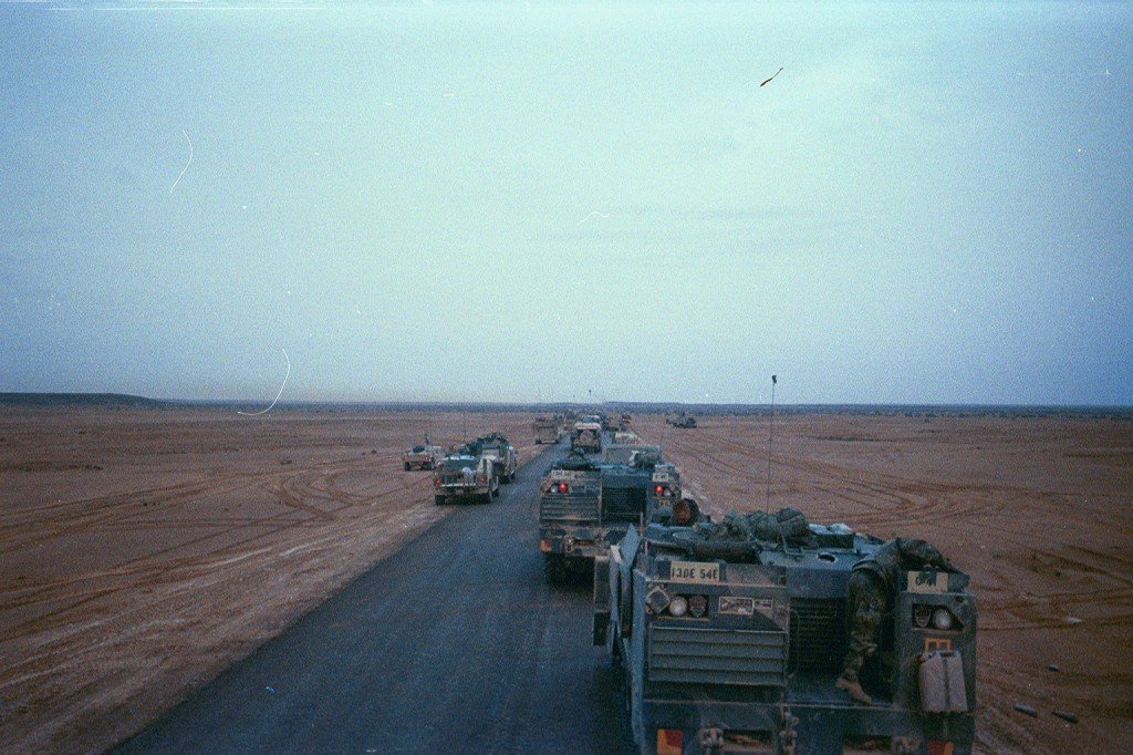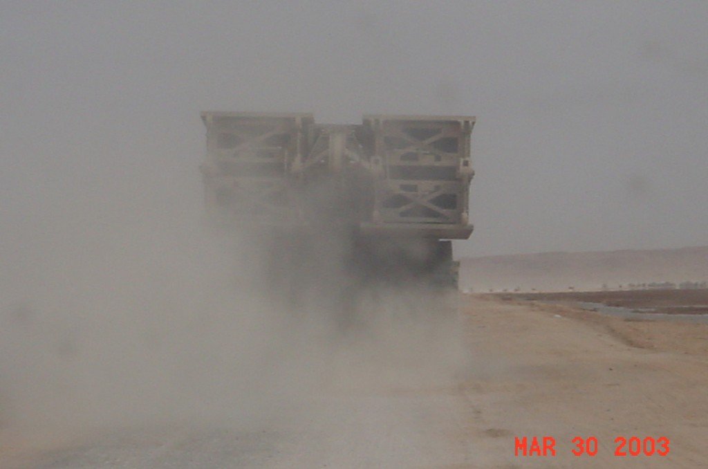 I don’t care what Lawrence thought; the desert is a boring, lonely, unpleasant place. Don’t tell my Kuwaiti friends, but if God ever decides to give the world an enema, the Middle Eastern desert is where he’ll stick the tube. We drove for three days straight, only stopping for diesel and maintenance every six or so hours. My ACE was the fastest of them all, but plenty of times the AVLBs in front would pull away and I would be alone in the vastness, except for the far-off smoke trails. After 60 hours of wide-awake, bone-jarring fun I caught myself asleep and veering off course several times. I started to hallucinate, and distinctly remembering talking to God and trying to explain to him why I didn’t believe in him, then hearing him tell me that I better change my mind mighty quick. Before we left I had passed out a bottle of No-doze to each of my squad members. I had had to smuggle them in country, along with my cell-phone. Everyone used up their entire bottle by the end of the three days. I washed mine down with 10 Mountain Dews. The last 10 hours(?) of that drive I spent standing up, hitting myself in the CVC helmet with the butt-end of my pistol to keep awake.
