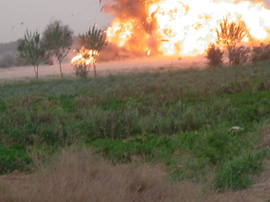 Up till now we hadn’t seen a single adult Iraqi. We had no news beyond what I picked up from the BBC on my shortwave but everything seemed to be going according to plan. The convoy slowed down in some little town and finally stopped. We could hear fighting a few blocks up ahead and waited patiently for the Cav to take care of business. Unfortunately we were completely exposed during that time. I spent two hours peering out of my cracked open hatch, holding my trusty one-shot Beretta at the ready. The lights in the town stayed on but nothing moved. We eventually heard auto rifle fire just a block or so back, and some mortars landed in the houses on either side. I heard later that the Hadjis opened up on the AVLBs with AKs and shot mortar rounds into their own neighbors’ houses. Some of the AVLB guys claimed to have gotten a few with their M16s but I doubt it. In any case, we lurched forward finally and I could breath again. We sped thru town and came out on an open road. The change in scenery was remarkable. Just a few miles away, on the other side of the river, it was dusty desert, but here was all greenery, palms, ferns, etc. We drove and stopped, drove and stopped. Finally, right before dark again, we stopped in the beginning of a massive clearing. a mile or so away along the tree-line I could see burning houses. The Cav’s Bradleys and M1s were spread out in the fields, advancing on the Iraqi positions. They moved steadily in, while the Iraqis ineffectually fired AKs and the occasional RPG. Each RPG was answered with several M1 HE rounds, so they didn’t do that much. It got dark, so I taped my NVG(Night Vision Goggles) to my binos and watched the little stick figures dart out from behind a burning house to fire a few AK rounds, only to be literally cut in half by the Bradleys’ 25mm cannon. It was hard to see, but looked like 25mm just made the stick figures disappear. Then I guess the Cav got impatient, so they called in CAS(Close Air Support) and the flyboys dropped what must have been a shit-load of napalm for 300meters very close to us along the other side of the clearing. It lit the world up like daytime. Here is part of it a buddy caught on film.
